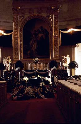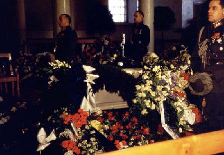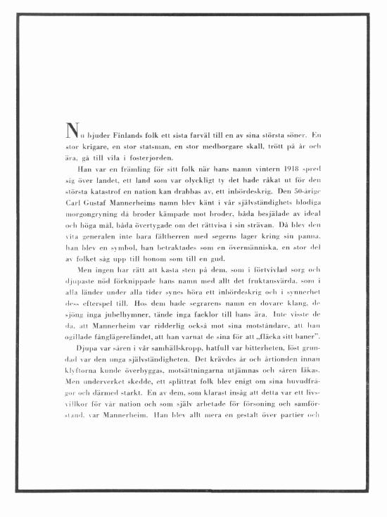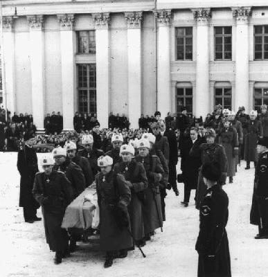 Mannerheimin hautajaiset järjestettiin Helsingissä 4.2. 1951. Vainaja tuotiin lentokoneella Sveitsistä Ruotsin kautta Helsinkiin. Malmin lentokentälle arkku saapui 2.2., jonka jälkeen yleisöllä oli tilaisuus käydä Helsingin Suurkirkossa (nykyisessä Tuomiokirkossa) osoittamassa kunnioitustaan. Ruumiinsiunauksen yhteydessä K-A. Fagerholm esitti valtion tervehdyksen. Hautajaissaatto kulki Unioninkatua, Pohjois-Esplanadinkatua, Mannerheimintietä, Arkadiankatua ja Hietaniemenkatua Hietaniemen hautausmaalle. Siellä Mannerheim haudattiin sankarihautojen keskelle. Kuvia hautajaisista