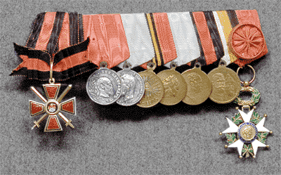 | 56. Nauhakiinnike, jossa seuraavat kunniamerkit 1. Pyhän Wladimirin Ritarikunta 4. luokka Miekkojen kera. Myönnetty 18.11.1905 2. Aleksanteri II:n hallituskauden muistomitali. Myönnetty 22.3.1896. 3. Nikolai II:n kruunajaisten muistomitali. Myönnetty 13.6.1896. 4. Venäjän-Japanin sodan 1904-1905 muistomitali. Myönnetty 1905. 5. Vuonna 1709 käydyn Poltavan taistelun 200-vuotis muistomitali. 6. Vuoden 1812 Isänmaallisen sodan 100-vuotis muistomitali. 7. Romanov-suvun 300-vuotisen hallituskauden juhlamuistomitali. 8. Kunnialegioonan upseeriristi. Myönnetty vuonna 1912. |