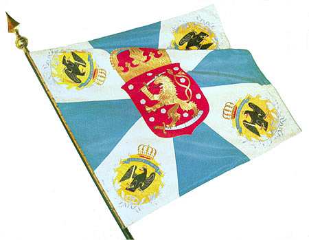 JЕгерский флаг был освящён в феврале 1918 года в Либаве. По углам флага с синим крестом, напоминающего флаг Финляндской Гвардии, находились гербы прусского образца с орлом, а посередине флага – герб Финляндии со львом. Основная